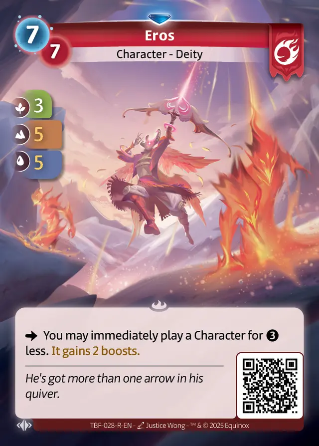 Eros is the god of love and procreation in the Greek pantheon. Son of Chaos, he is one of the primordial deities along with Gaia, Nyx, Tartare and Erebus. He was born from the cosmic egg, created by the union of Aether and Chaos. In early depictions he represented a non-sexual union, like friendship. The sexual depiction of Eros came about with the castration of Uranus by Cronus, when Cronus threw his father's genitals into the sea. This act gave rise to Aphrodite, Himeros and the new incarnation of Eros. In both his primordial and subsequent depictions, he represents the force of attraction that pushes partners to be together.