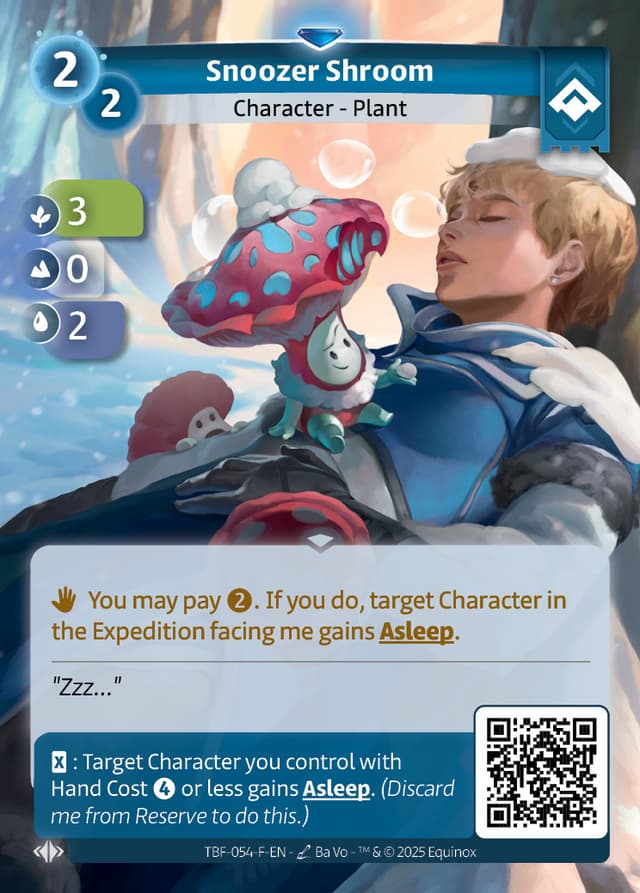 As I reach out to her shoulder to shake her awake, I notice something on her chest, gazing thoughtfully at her sleeping face. It's a mush. Well, a Snoozer Shroom to be precise. I quickly notice that a bit of its cap has been nibbled away. Well, I guess that explains the soldier's untimely nap. Another novice who didn't pay attention during their training about the dangers of the forest. Still, the mush's red cap with blue scales should have been an obvious warning. I borrow the recruit's waterproof gloves and pick up the little mushroom, which then offers me a bit of its cap. No thanks, little one, I just ate. And I know all about your narcotic properties. But I'll save it for later so I can make a soup that brings on a deep, refreshing sleep, like certain moms do for their overactive kids. In the meantime, I'll need to brew some herbal tea for the recruit, who'll likely wake up with a nasty cold… What was she doing out here all alone, anyway?