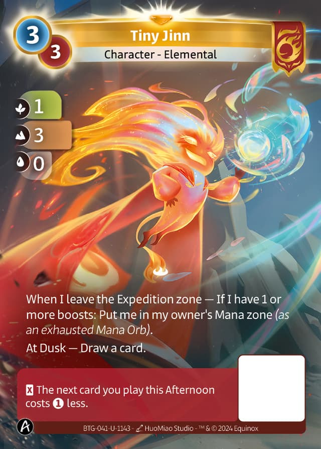 When I leave the Expedition zone — If I have 1 or more boosts: Put me in my owner's Mana zone (as an exhausted Mana Orb).