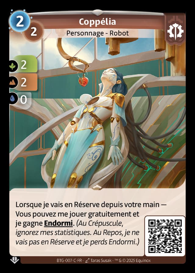 Lorsque je vais en Réserve depuis votre main — Vous pouvez me jouer gratuitement et je gagne Endormi.(Ignorez mes statistiques pendant le Crépuscule. Au Repos, je ne vais pas en Réserve et je perds Endormi.)