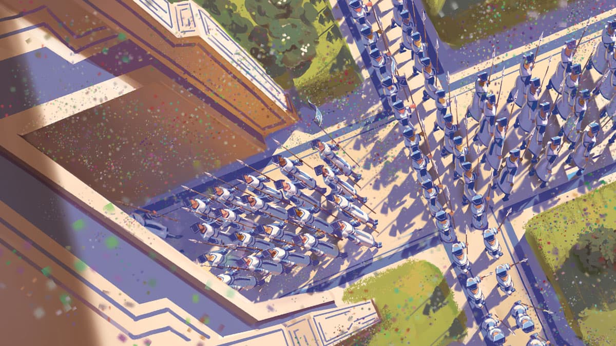 Mais avant qu'elle ne puisse parier quelques piécettes au bonneteau, ou se laisser tenter par une crêpe fourrée aux haricots rouges, elle entend le bruit des bottes d'une nouvelle procession. Montant sur un réverbère, elle observe le pas cadencé des militaires de l'Aegis, avec leurs bottes bien cirées, leurs boucliers rutilants. Le défilé se dirige en azimut brutal vers les portes, comme une armée de petits soldats de plomb.