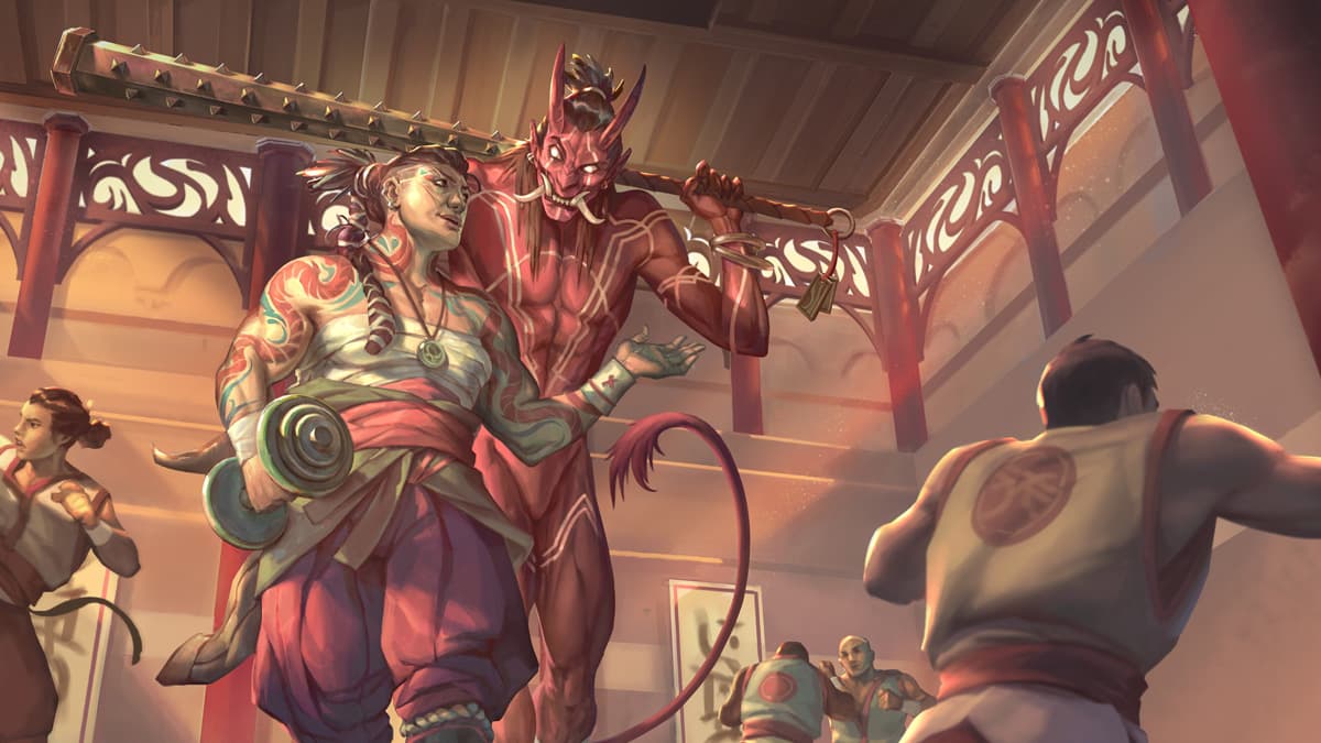 The demon leaps too, tetsubō held high above his horned head. His entire body smokes and hisses. The spiked mass traces a glowing arc through the air as he descends toward the Kinemancer.