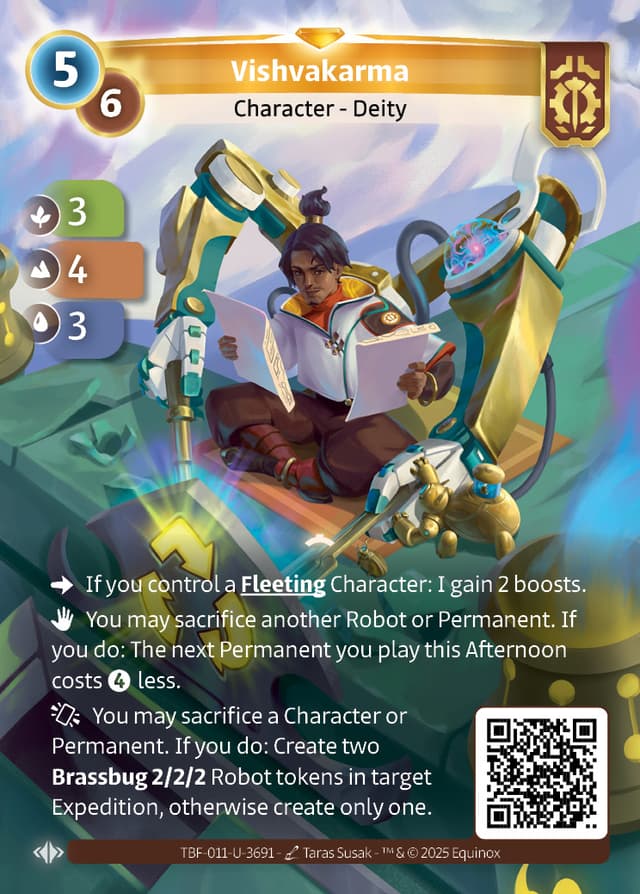 You may sacrifice a Character or Permanent. If you do: Create two Brassbug 2/2/2 Robot tokens in target Expedition, otherwise create only one.