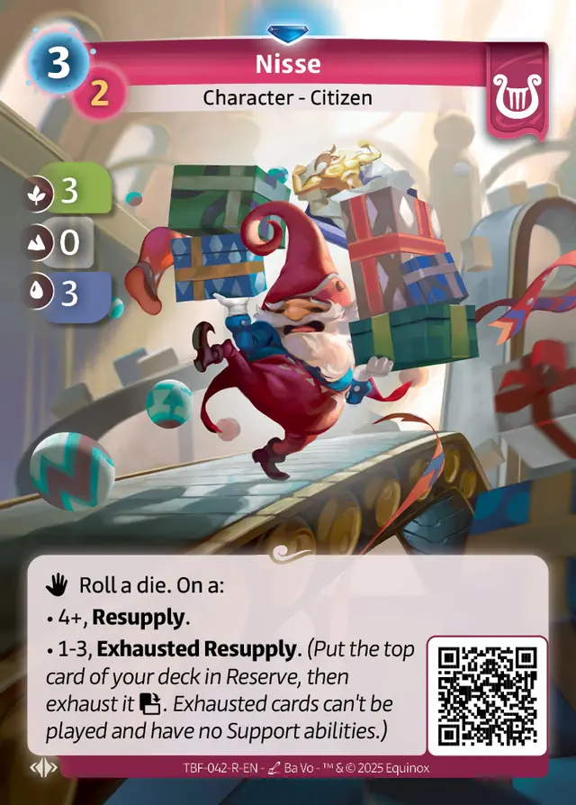 • 1-3, Exhausted Resupply.(Put the top card of your deck in Reserve, then exhaust it . Exhausted cards can't be played and have no Support abilities.)