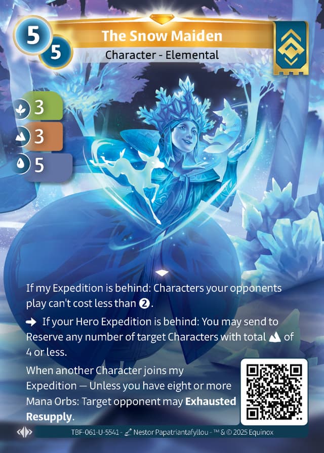 When another Character joins my Expedition — Unless you have eight or more Mana Orbs: Target opponent may Exhausted Resupply.