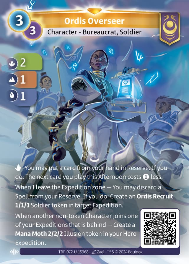 When I leave the Expedition zone — You may discard a Spell from your Reserve. If you do: Create an Ordis Recruit 1/1/1 Soldier token in target Expedition.