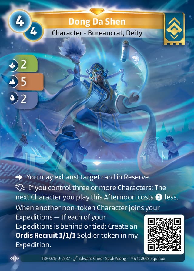 When a non-token Character other than me joins your Expeditions — If both of your Expeditions are behind or tied: Create an Ordis Recruit 1/1/1 Soldier token in my Expedition.
