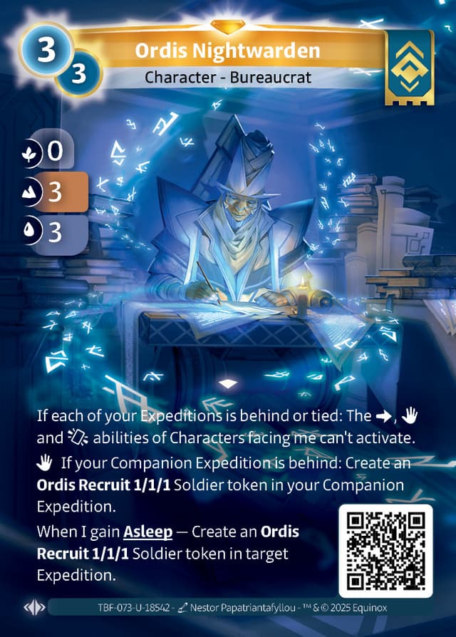 When I gain Asleep — Create an Ordis Recruit 1/1/1 Soldier token in target Expedition.