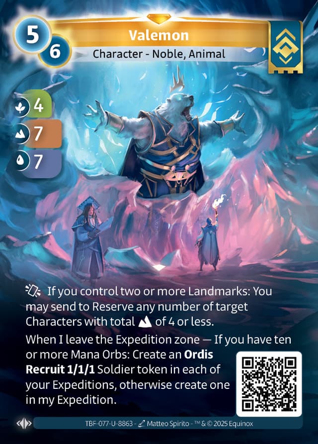 When I leave the Expedition zone — If you have ten or more Mana Orbs: Create an Ordis Recruit 1/1/1 Soldier token in each of your Expeditions, otherwise create one in mine.