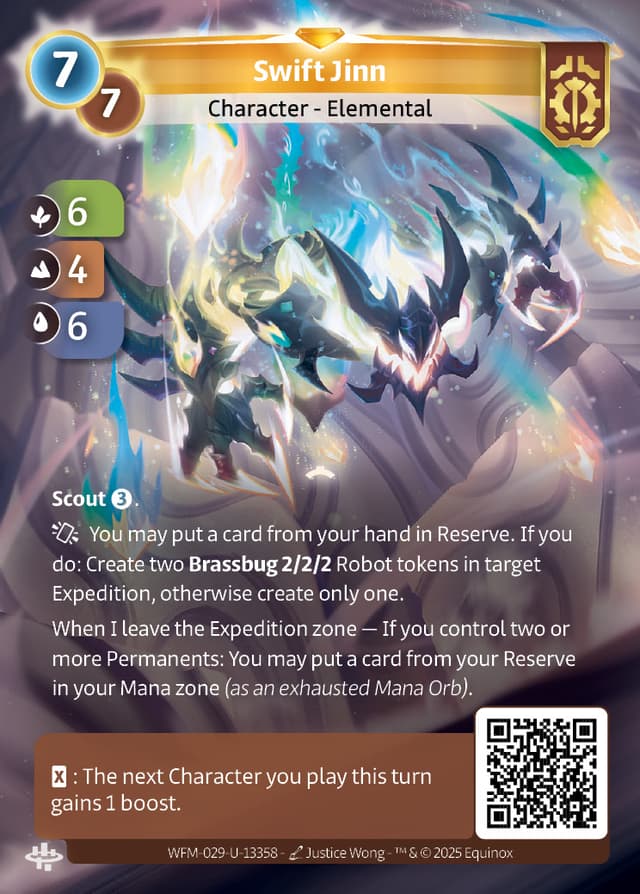 You may put a card from your hand in Reserve. If you do: Create two Brassbug 2/2/2 Robot tokens in target Expedition, otherwise create only one.
