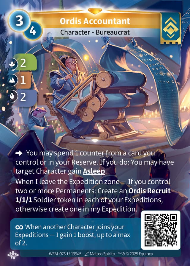 When I leave the Expedition zone — If you control two or more Permanents: Create an Ordis Recruit 1/1/1 Soldier token in each of your Expeditions, otherwise create one in my Expedition.
