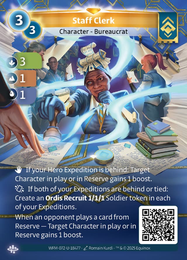 If both of your Expeditions are behind or tied: Create an Ordis Recruit 1/1/1 Soldier token in each of your Expeditions.