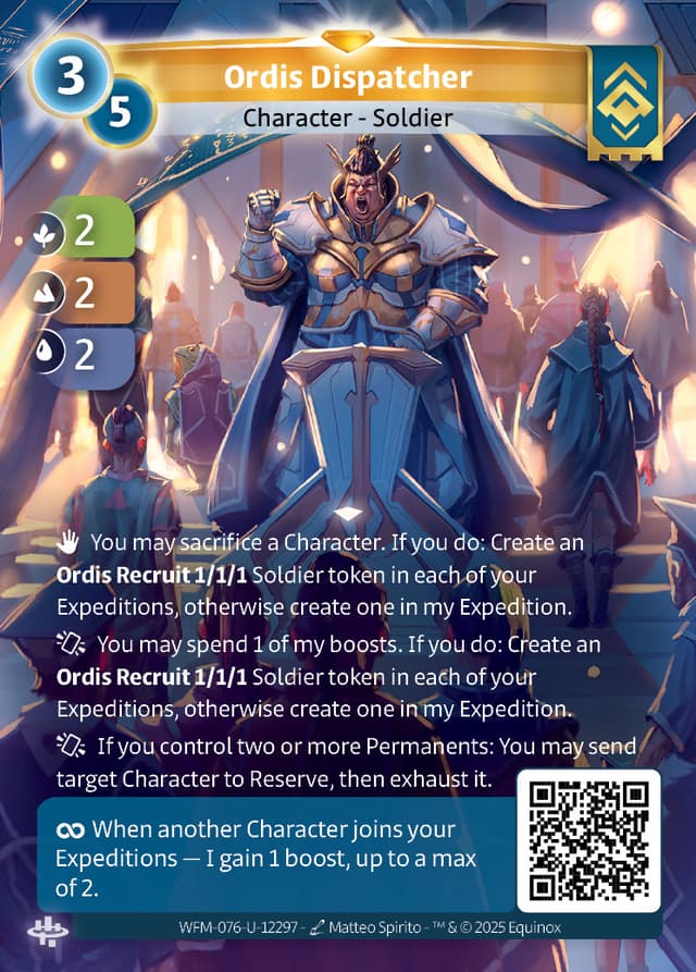 You may spend 1 of my boosts. If you do: Create an Ordis Recruit 1/1/1 Soldier token in each of your Expeditions, otherwise create one in my Expedition.