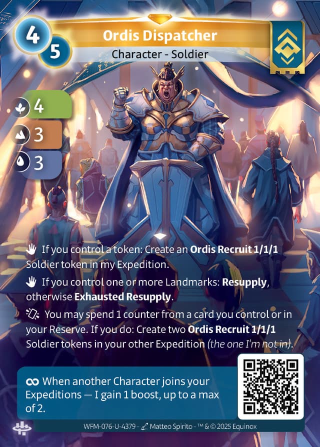 If you control a token: Create an Ordis Recruit 1/1/1 Soldier token in my Expedition.