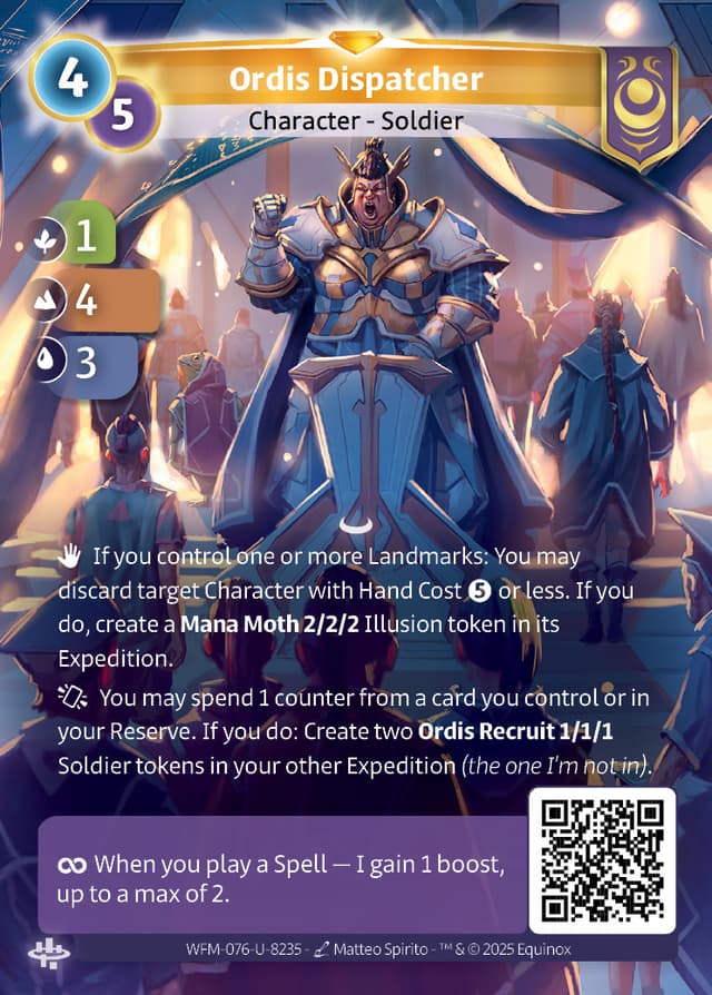 You may spend 1 counter from a card you control or in your Reserve. If you do: Create two Ordis Recruit 1/1/1 Soldier tokens in your other Expedition (the one I'm not in).