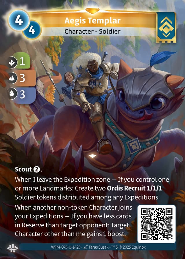 When I leave the Expedition zone — If there's a card in your Landmarks: Create two Ordis Recruit 1/1/1 Soldier tokens distributed among any Expeditions.
