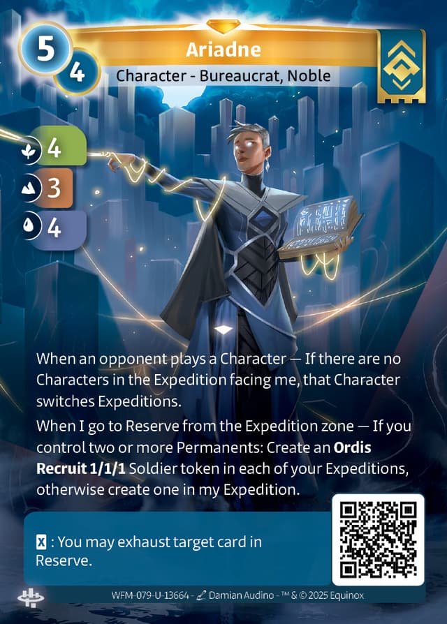 When I go to Reserve from the Expedition zone — If you control two or more Permanents: Create an Ordis Recruit 1/1/1 Soldier token in each of your Expeditions, otherwise create one in my Expedition.