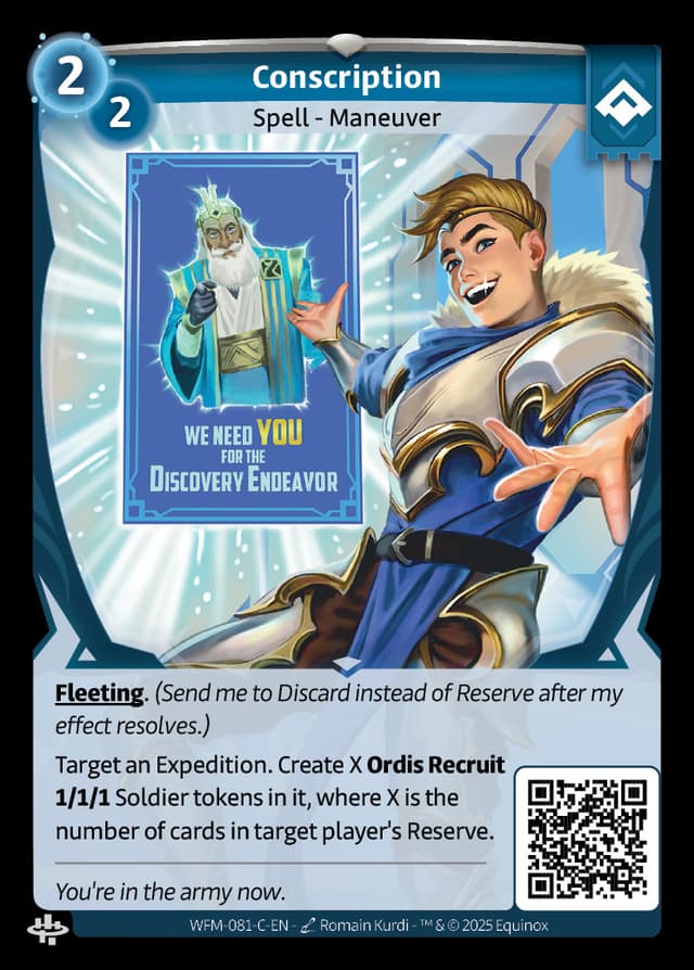 Target an Expedition. Create X Ordis Recruit 1/1/1 Soldier tokens in it, where X is the number of cards in target player's Reserve.