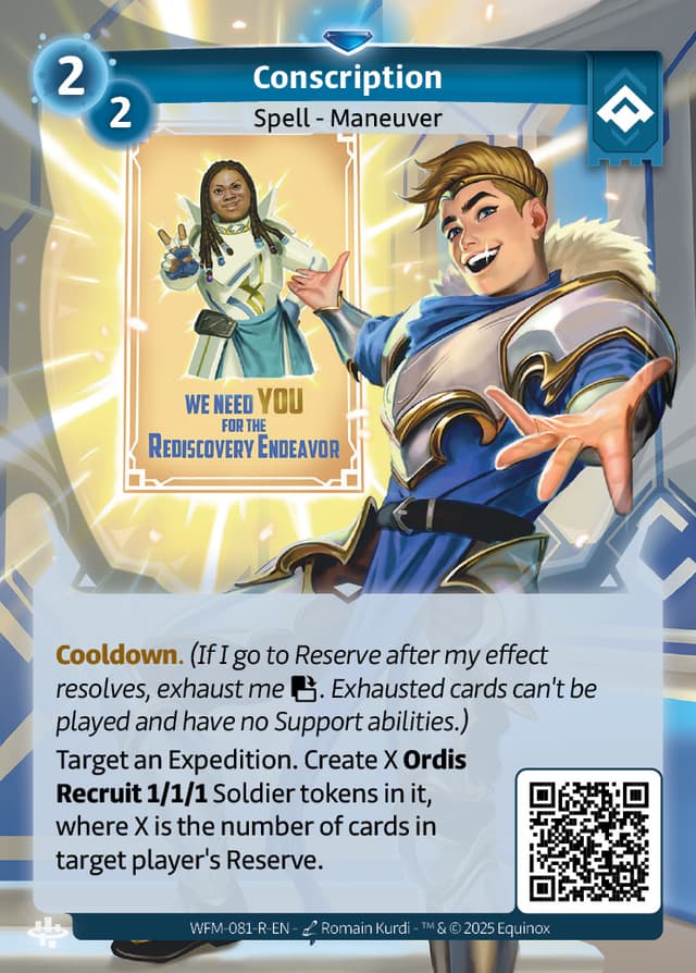 Target an Expedition. Create X Ordis Recruit 1/1/1 Soldier tokens in it, where X is the number of cards in target player's Reserve.