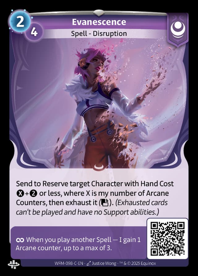 Send to Reserve target Character with Hand Cost + or less, where X is my number of Arcane Counters, then exhaust it ().(Exhausted cards can't be played and have no Support abilities.)