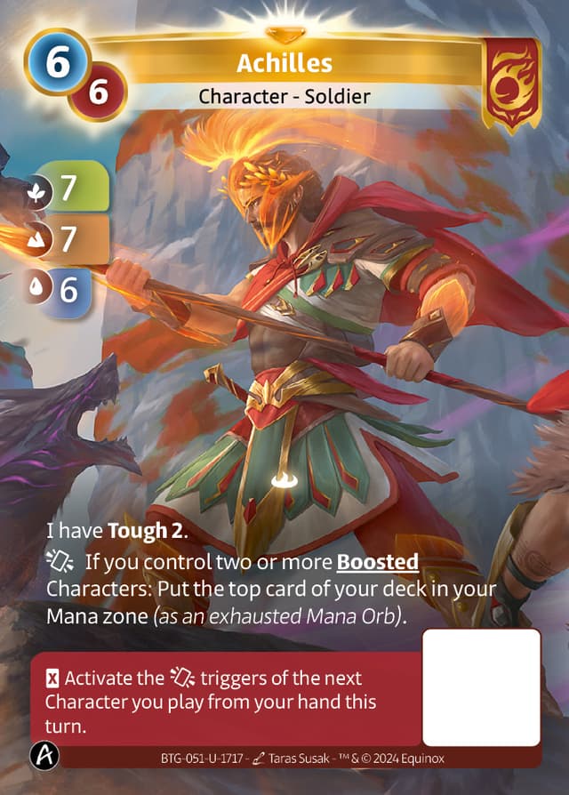 If you control two or more Boosted Characters: Put the top card of your deck in your Mana zone (as an exhausted Mana Orb).