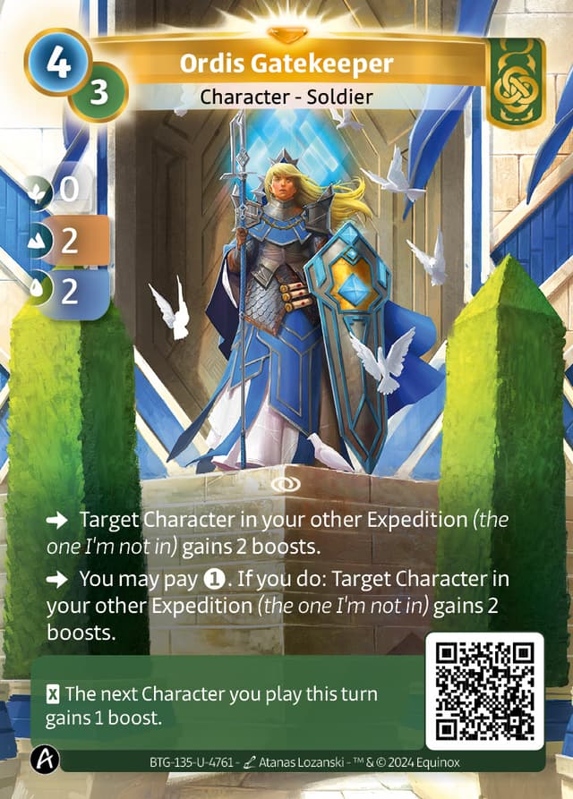 Target Character in your other Expedition (the one I'm not in) gains 2 boosts.
