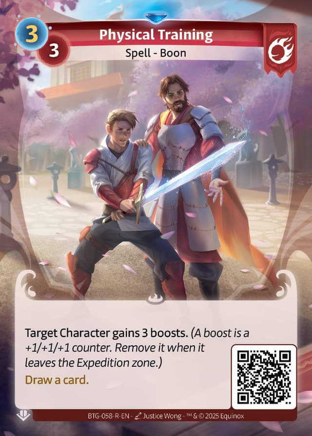 Target Character gains 3 boosts.(A boost is a +1/+1/+1 counter. Remove it when it leaves the Expedition zone.)