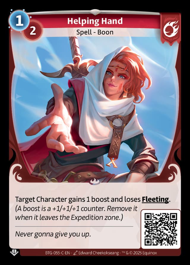 Target Character gains 1 boost and loses Fleeting.(A boost is a +1/+1/+1 counter. Remove it when it leaves the Expedition zone.)