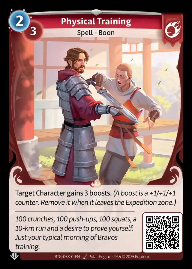 Target Character gains 3 boosts.(A boost is a +1/+1/+1 counter. Remove it when it leaves the Expedition zone.)