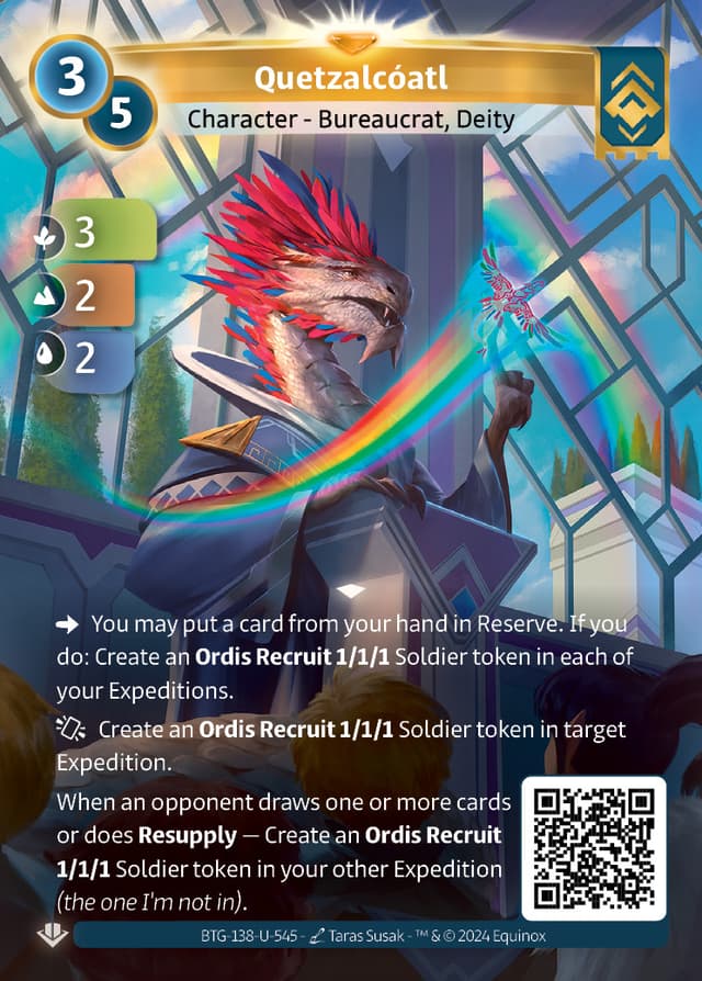 When an opponent draws one or more cards or does Resupply — Create an Ordis Recruit 1/1/1 Soldier token in your other Expedition (the one I'm not in).