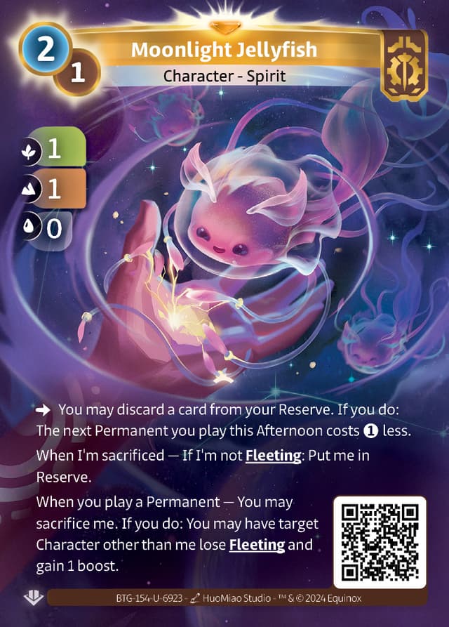 When you play a Permanent — You may sacrifice me. If you do: You may target a Character other than me, it loses Fleeting and gains 1 boost.