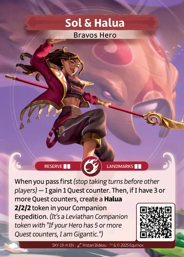When you pass first (stop taking turns before other players) — I gain 1 Quest counter. Then, if I have 3 or more Quest counters, create a Halua 2/2/2 token in your Companion Expedition.(It's a Leviathan Companion token with "If your Hero has 5 or more Quest counters, I am Gigantic.")