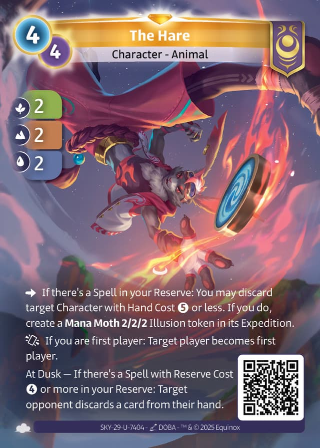 If there's a Spell in your Reserve: You may discard target Character with Hand Cost or less. If you do, create a Mana Moth 2/2/2 Illusion token in its Expedition.