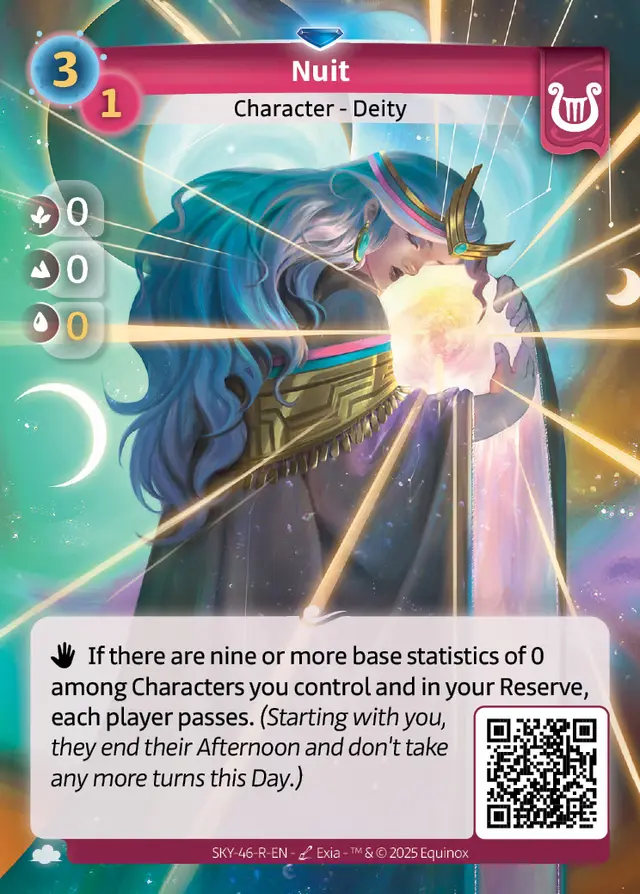 If there are nine or more base statistics of 0 among Characters you control and in your Reserve, each player passes.(Starting with you, they end their Afternoon and don't take any more turns this Day.)