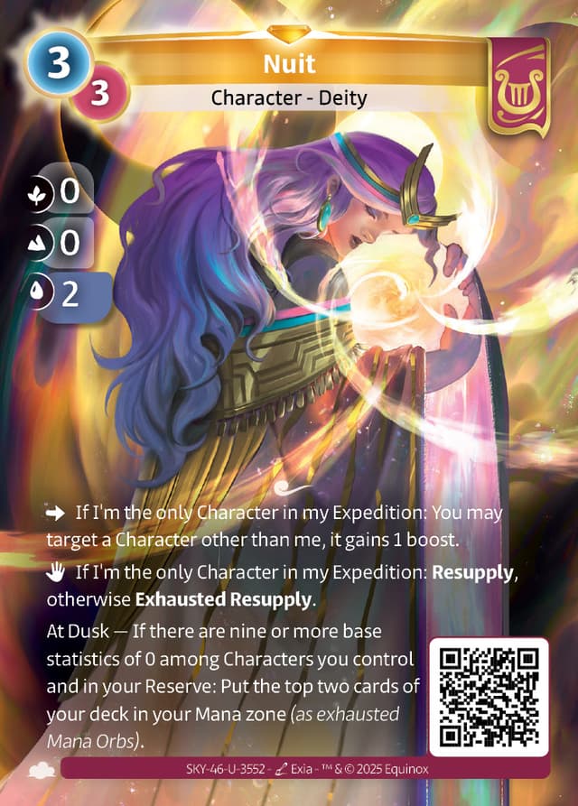 At Dusk — If there are nine or more base statistics of 0 among Characters you control and in your Reserve: Put the top two cards of your deck in your Mana zone (as exhausted Mana Orbs).