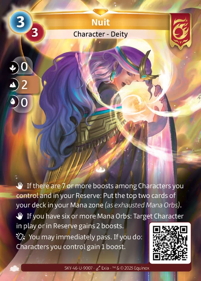 If there are 7 or more boosts among Characters you control and in your Reserve: Put the top two cards of your deck in your Mana zone (as exhausted Mana Orbs).