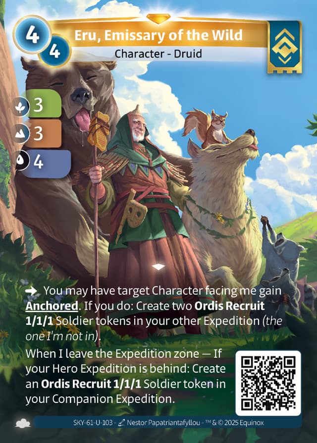 You may have target Character facing me gain Anchored. If you do: Create two Ordis Recruit 1/1/1 Soldier tokens in your other Expedition (the one I'm not in).