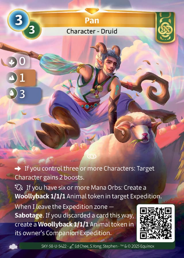 If you have six or more Mana Orbs: Create a Woollyback 1/1/1 Animal token in target Expedition.