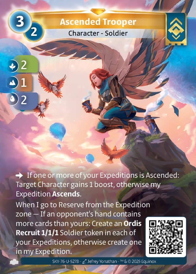 When I go to Reserve from the Expedition zone — If an opponent's hand contains more cards than yours: Create an Ordis Recruit 1/1/1 Soldier token in each of your Expeditions, otherwise create one in my Expedition.
