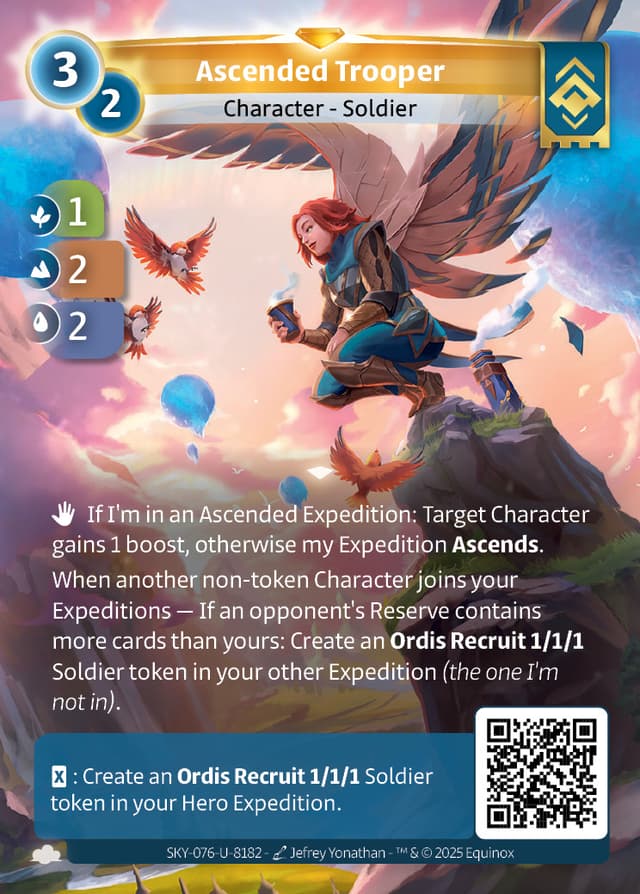 When another non-token Character joins your Expeditions — If an opponent's Reserve contains more cards than yours: Create an Ordis Recruit 1/1/1 Soldier token in your other Expedition (the one I'm not in).