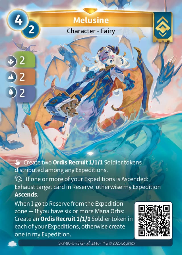 When I go to Reserve from the Expedition zone — If you have six or more Mana Orbs: Create an Ordis Recruit 1/1/1 Soldier token in each of your Expeditions, otherwise create one in mine.