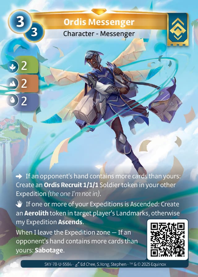 If an opponent's hand contains more cards than yours: Create an Ordis Recruit 1/1/1 Soldier token in your other Expedition (the one I'm not in).
