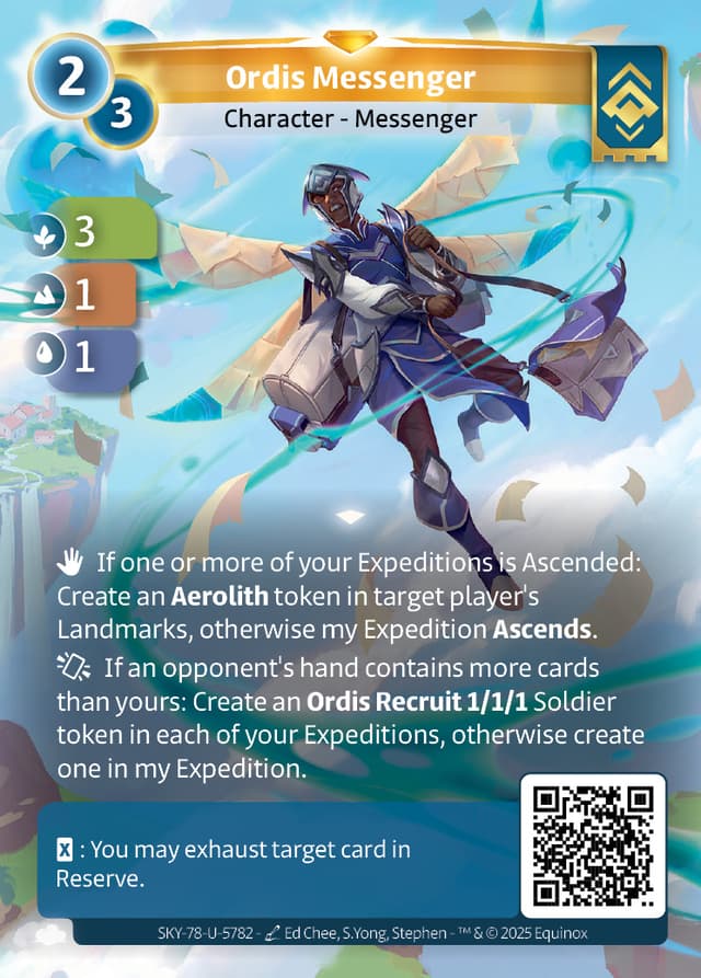 If an opponent's hand contains more cards than yours: Create an Ordis Recruit 1/1/1 Soldier token in each of your Expeditions, otherwise create one in my Expedition.