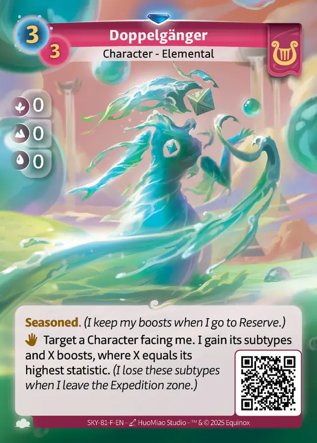 Target a Character facing me. I gain its subtypes and X boosts, where X equals its highest statistic.(I lose these subtypes when I leave the Expedition zone.)