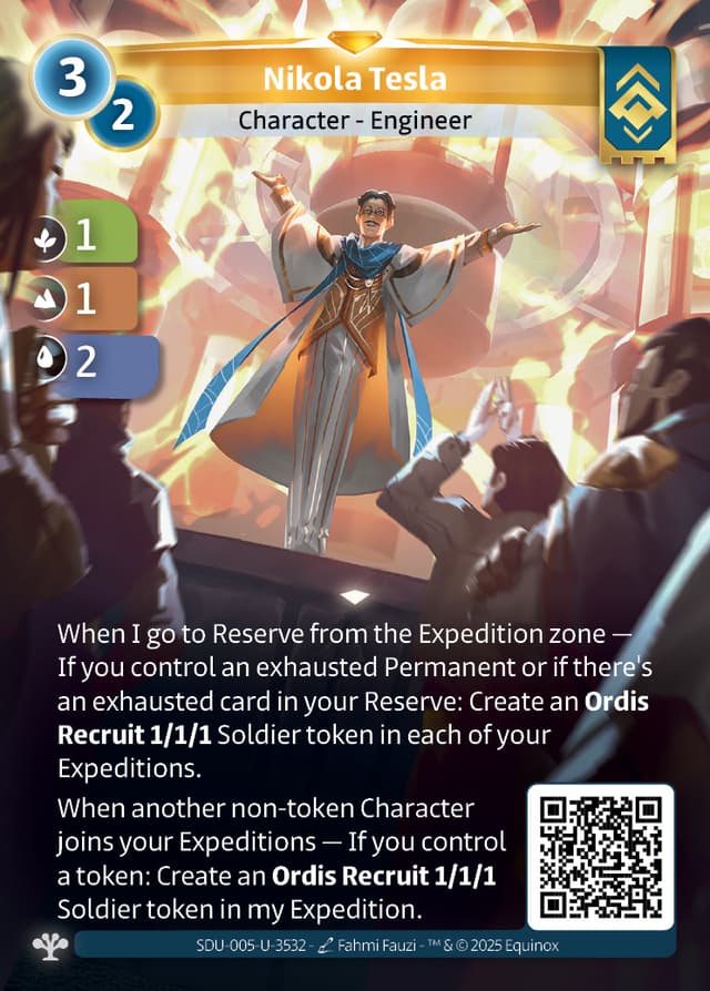 When I go to Reserve from the Expedition zone — If there's an exhausted card in your Reserve or you control an exhausted Permanent: Create an Ordis Recruit 1/1/1 Soldier token in each of your Expeditions.