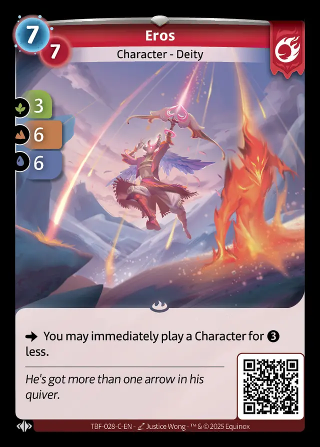 Eros is the god of love and procreation in the Greek pantheon. Son of Chaos, he is one of the primordial deities along with Gaia, Nyx, Tartare and Erebus. He was born from the cosmic egg, created by the union of Aether and Chaos. In early depictions he represented a non-sexual union, like friendship. The sexual depiction of Eros came about with the castration of Uranus by Cronus, when Cronus threw his father's genitals into the sea. This act gave rise to Aphrodite, Himeros and the new incarnation of Eros. In both his primordial and subsequent depictions, he represents the force of attraction that pushes partners to be together.