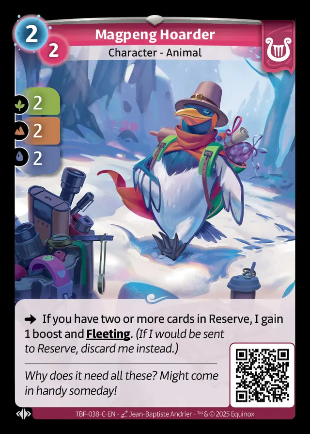 But it's not a garbage dump. All the items are in perfect condition. And besides, I recognize some of them! Those headphones, that's Tamati's! It was stolen from the camp a couple of days ago. One, two, three, four things... With horror, I realize this is a thief's den. And then I see a strange figure enter the clearing. It's an elegant cross between a magpie and a penguin. Clearly pleased with himself, he waddles around, carrying on his back a pack filled with items as disparate as those strewn across the ground. He's even wearing a hat I remember from another expedition. And I'm confident that its owner didn't have webbed feet and an orange beak. He's probably just dropping off his plunder from his latest loot run. I look at what he's carrying: cartographers' papers, chocolate eggs... No! He's also got the rolling pin that Hestia uses. How will she make those delicious cookies now?