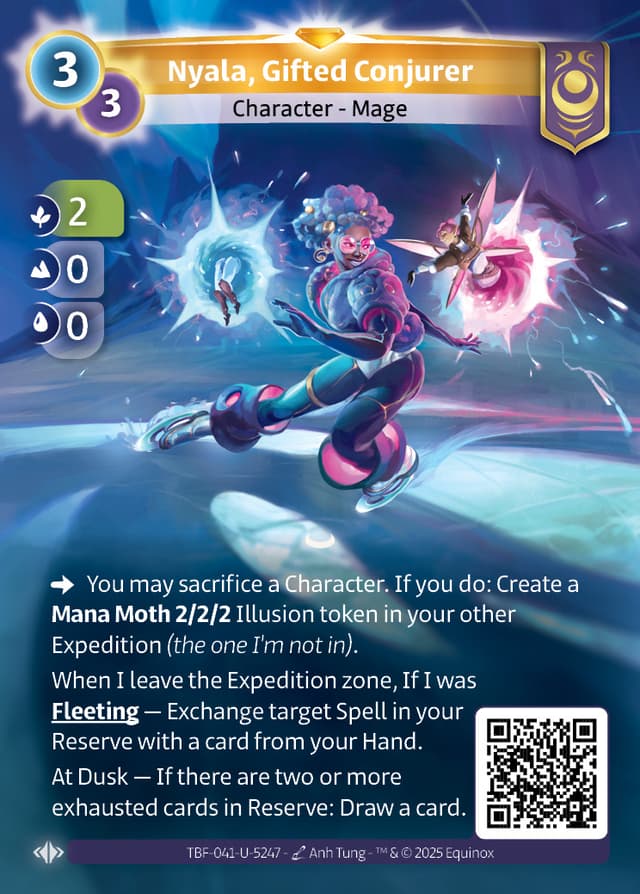You may sacrifice a Character. If you do: Create a Mana Moth 2/2/2 Illusion token in your other Expedition (the one I'm not in).