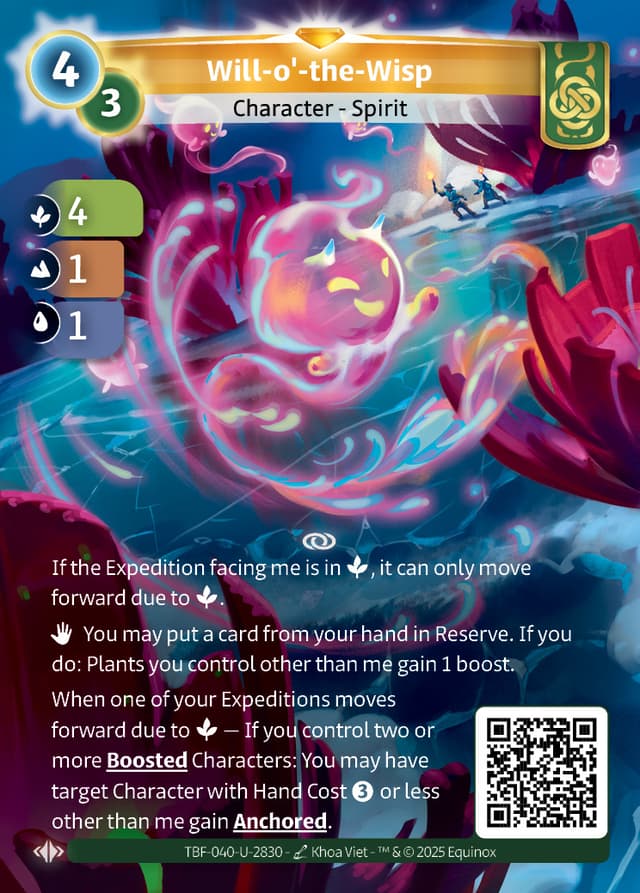 When one of your Expeditions moves forward due to — If you control two or more Boosted Characters: You may target a Character with Hand Cost or less other than me, it gains Anchored.