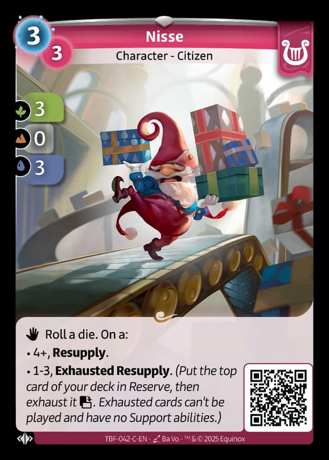 • 1-3, Exhausted Resupply.(Put the top card of your deck in Reserve, then exhaust it . Exhausted cards can't be played and have no Support abilities.)